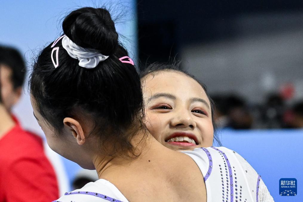 11月16日,福建队选手邱祺缘在夺冠后与上海队选手秦心怡拥抱。