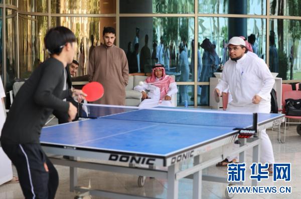 11月16日,中国和沙特学生在沙特苏尔坦亲王大学校园内举行的中沙青年文化交流活动上打乒乓球。记者 罗晨 摄