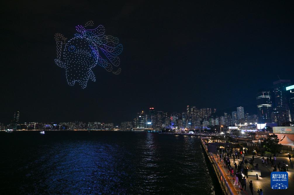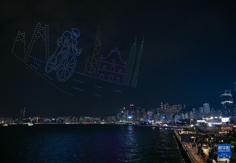 11月18日,"体育力量 闪耀香江"大型无人机表演在香港维多利亚港举行。