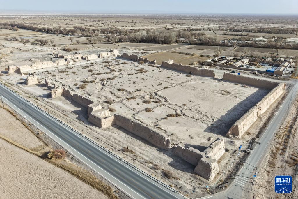 11月18日在甘肃省瓜州县锁阳城镇常乐村拍摄的破城子遗址全景(无人机照片)。