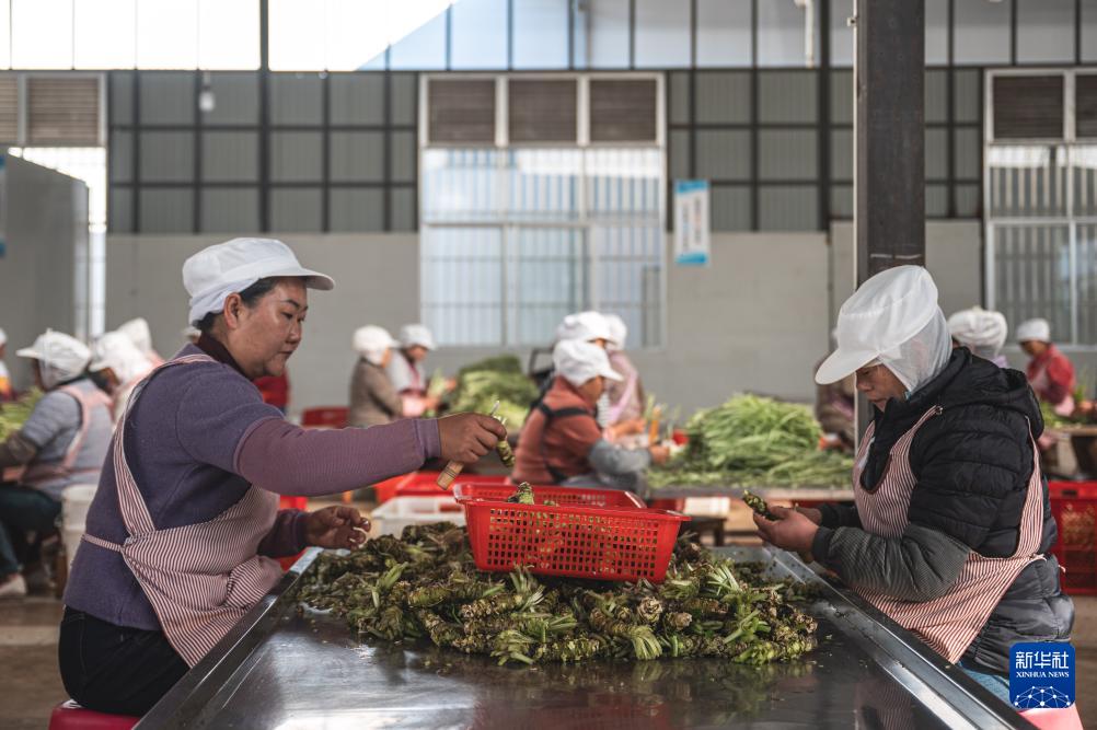 11月18日,工人在云南省保山市隆阳区板桥镇的保山市山葵实业开发有限责任公司加工车间内初加工山葵叶柄。