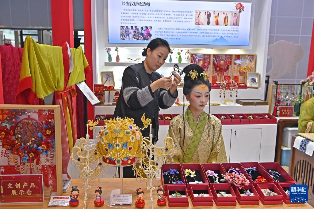 11月18日,妆造师在第三届全国劳务协作暨劳务品牌发展大会上为模特扮上古装。
