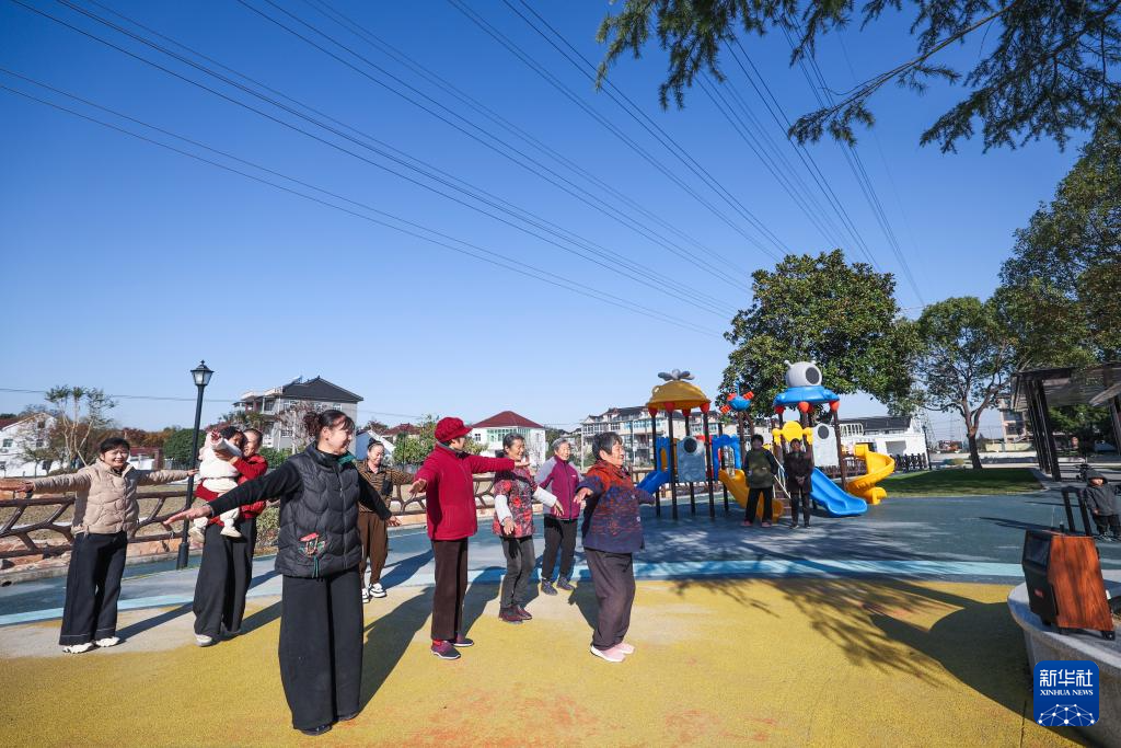 11月19日,吕山乡吕山村的村民在新建的村民公园里跳健身操。