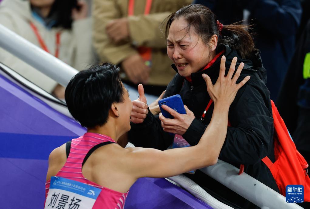 11月19日,广东队选手刘景扬(左)在比赛后和母亲交流。她夺得冠军。