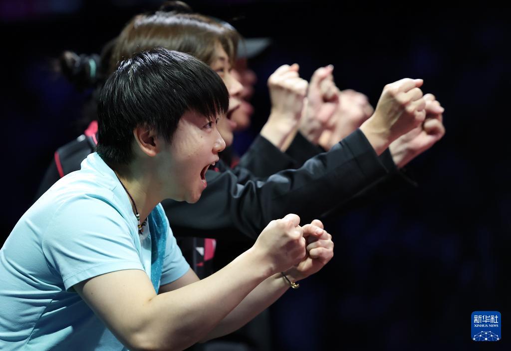 11月19日,河北队选手孙颖莎(左一)和队友在场边为河北队选手何卓佳助威。