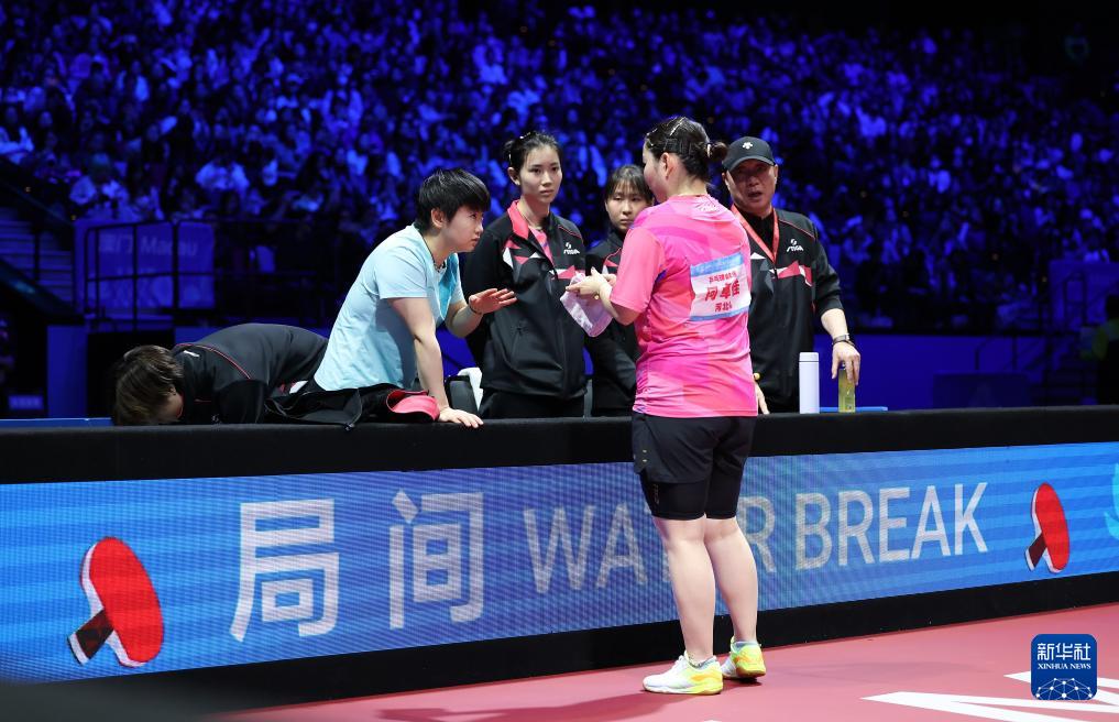 11月19日,河北队选手何卓佳(前右)在女单比赛中与团队沟通。