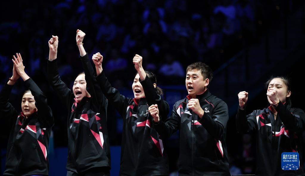 11月19日,山东队选手陈梦(右一)和队友及教练在比赛后庆祝夺冠。