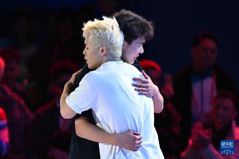 11月19日,湖北队选手王瑞苗(前)获胜后拥抱江苏队选手亓祥宇。