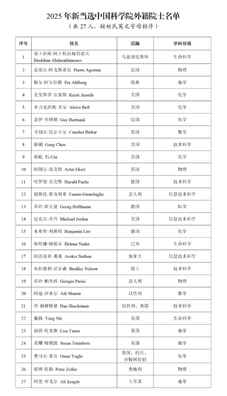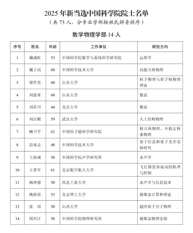 根据《中国科学院院士章程》《中国科学院院士增选工作实施办法(试行)》《中国科学院外籍院士选举办法》等规定,2025年中国科学院选举产生了73名中国科学院院士和27名中国科学院外籍院士。
