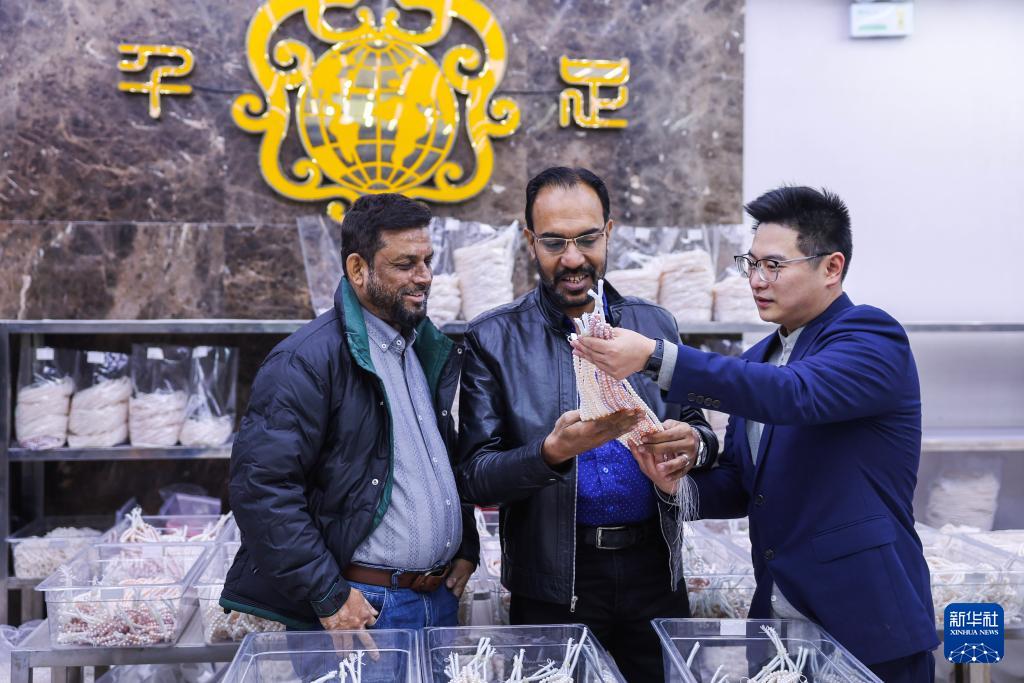 11月20日,在诸暨市山下湖镇的华东国际珠宝城,导游(右)在给来自巴基斯坦的游客介绍珍珠的种类和特质。