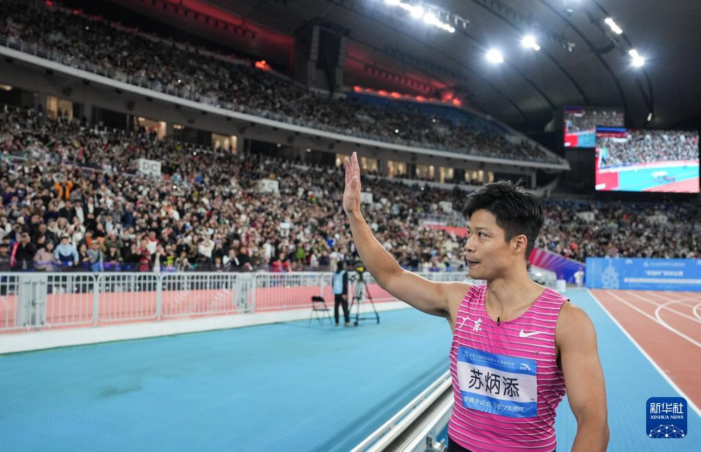 11月20日,广东队选手苏炳添(中)在比赛后向观众致意。