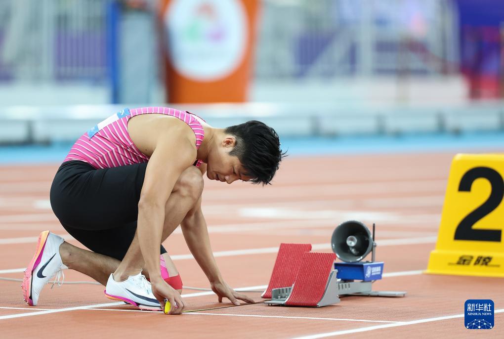 11月20日,广东队选手苏炳添(前)在比赛前准备起跑。