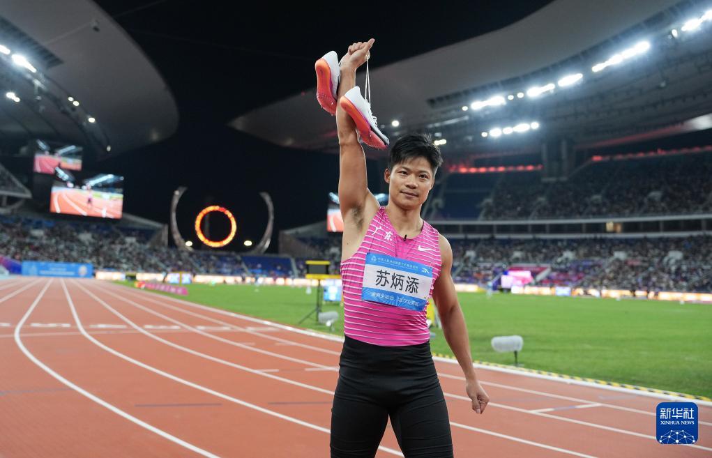 11月20日,广东队选手苏炳添在比赛后向观众致意。