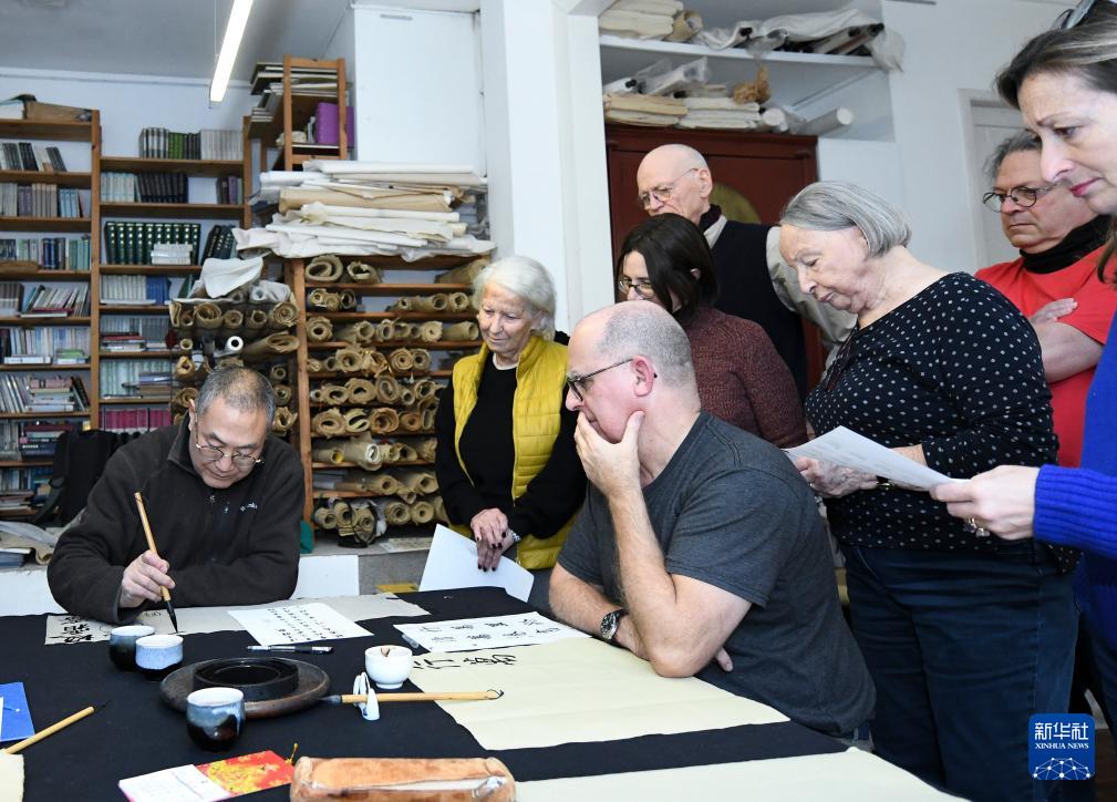 11月19日,在瑞士日内瓦,“乐鱼亭”书法工作室的学员观摩书法老师王飞(左一)写字。新华社记者 连漪 摄