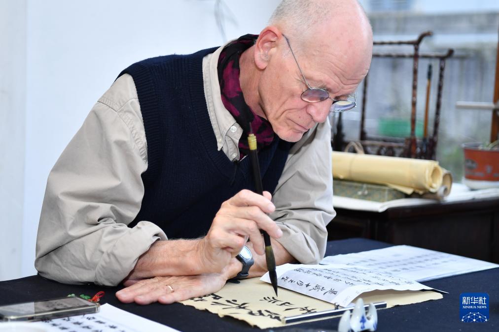 11月19日,在瑞士日内瓦,“乐鱼亭”书法工作室学员菲利普临写《后赤壁赋》。新华社记者 连漪 摄