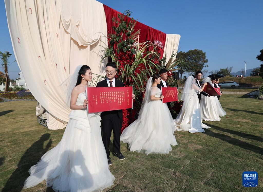 当日,浙江省诸暨市安华镇在丰江周村举办"越风有喜·诸事暨成——情定丰江 甜蜜一生"为主题的集体婚礼,通过举行跨百年蔗、红绳结蔗、共饮"安华曲"等特色仪式,为新人打造既庄重又甜蜜的婚礼体验,倡导"婚事新办简办"的文明新风。