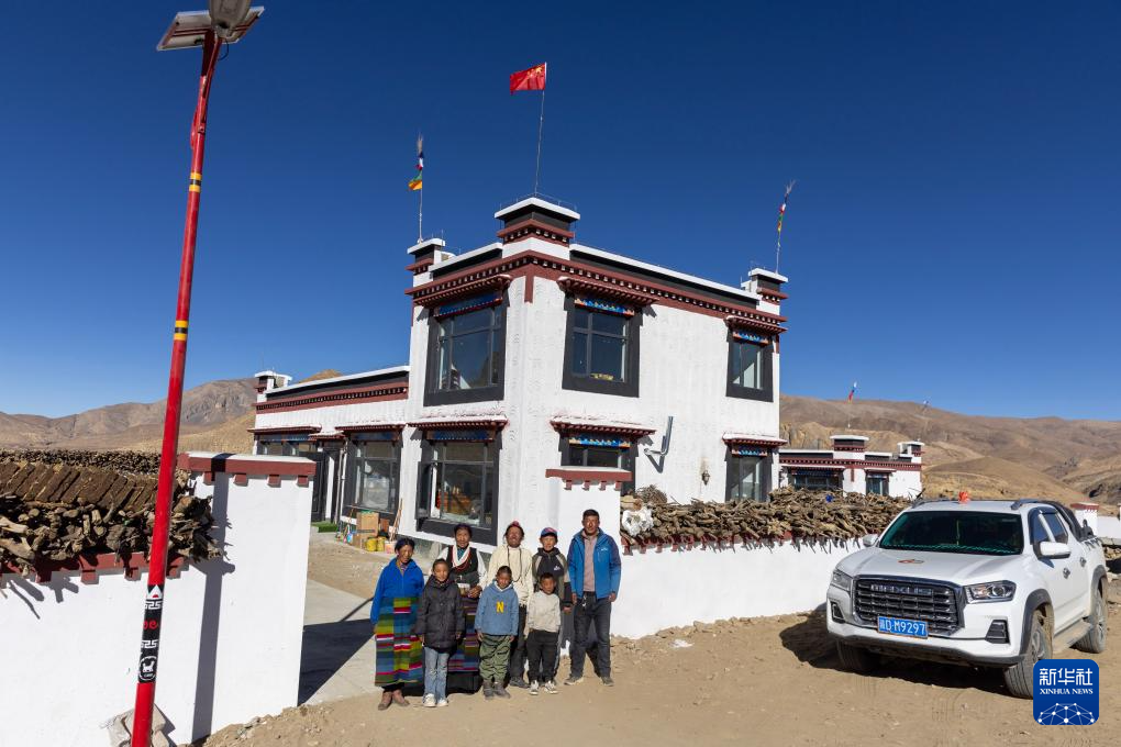 西藏定日县曲洛乡热木青村村民尼玛平措(右一)一家在新房和自家的汽车前拍照(11月12日摄)。