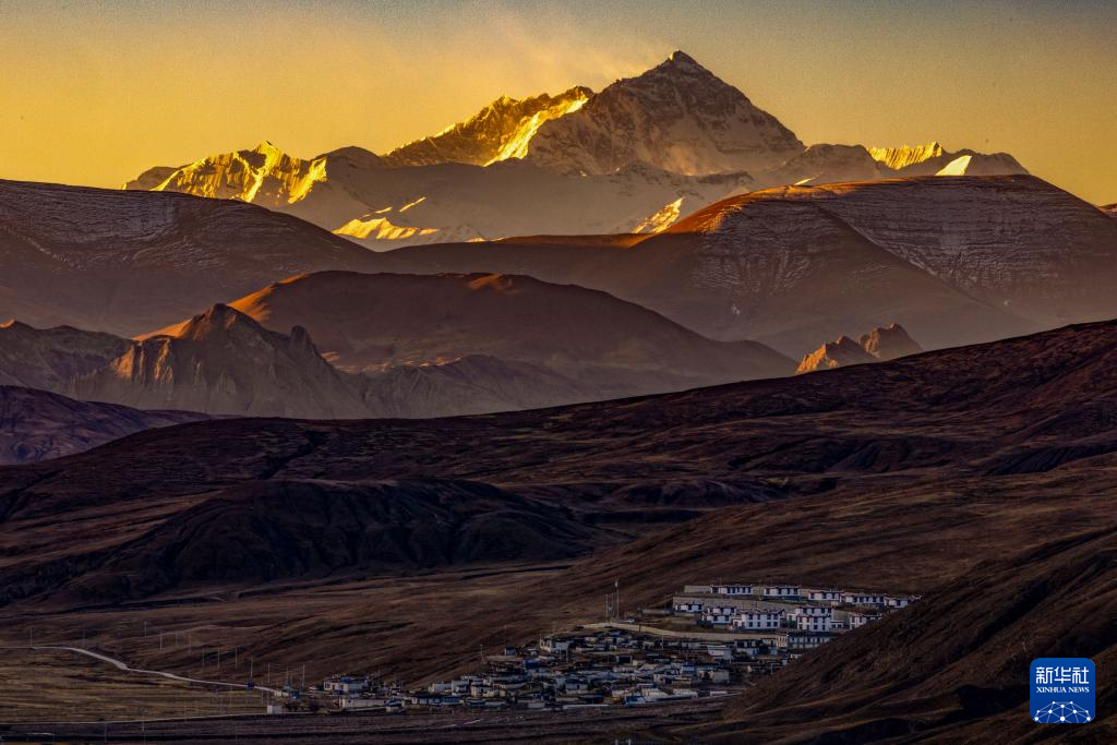 日出时分拍摄的西藏定日县协格尔镇查那村,村中地势较高处为建成并交付使用的新房(11月13日摄)。