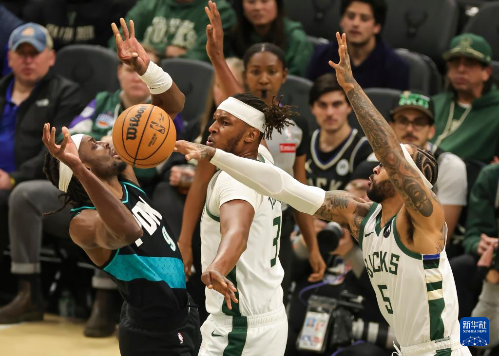 11月24日,开拓者队球员格兰特(左)与雄鹿队球员特纳(中)、特伦特在比赛中拼抢。
