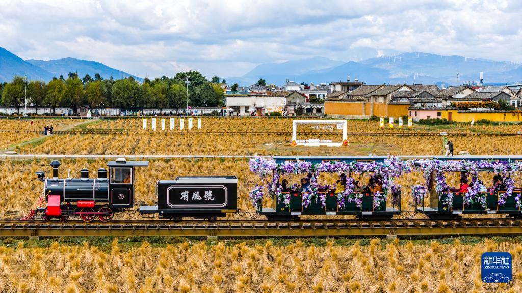 游客在喜洲古镇乘坐观光小火车(11月24日摄,无人机照片)。
