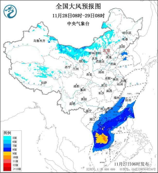 预计,11月27日08时至28日08时,新疆东部、内蒙古中西部、甘肃西部、宁夏北部、山东半岛、江苏沿海以及青海西南部、西藏中西部等地有5~7级大风,阵风8~9级,其中新疆东部山口地区、内蒙古西部部分地区风力可达8级,阵风9~10级;11月27日08时至28日08时台湾海峡、巴士海峡、南海北部和中东部海域将有8级、阵风9级的东北风,其中南海中西部和西南部海域的风力可达10级、阵风11级,南海中东部海域的风力可达9级、阵风10级,南海东南部海域将有8级、阵风9级的东南风。