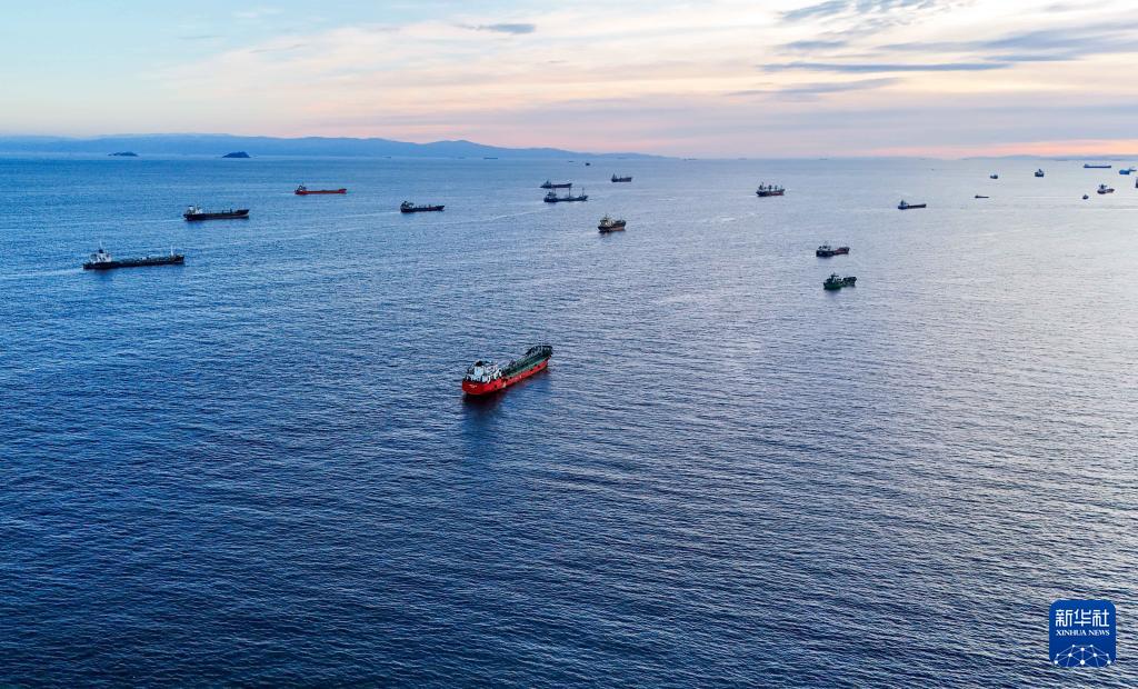 这是11月24日拍摄的停泊在土耳其伊斯坦布尔马尔马拉海上的船只(无人机照片)。