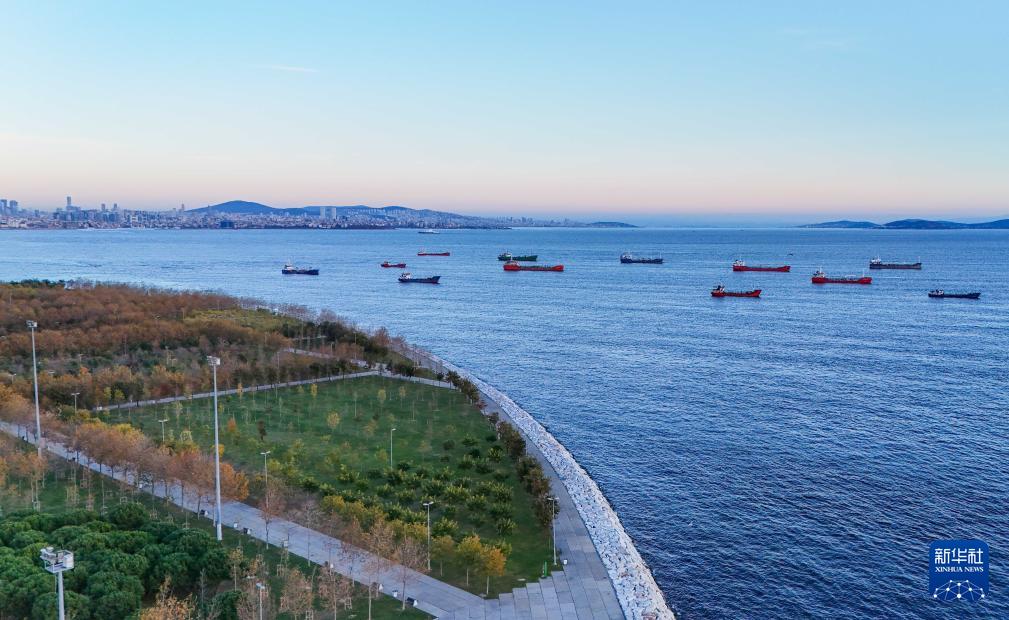 这是11月25日拍摄的停泊在土耳其伊斯坦布尔马尔马拉海上的船只(无人机照片)。