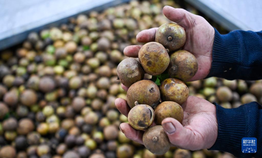 这是在海南省白沙黎族自治县邦溪镇的闻儒生物科技(海南)有限公司内等待加工的油茶果(11月19日摄)。