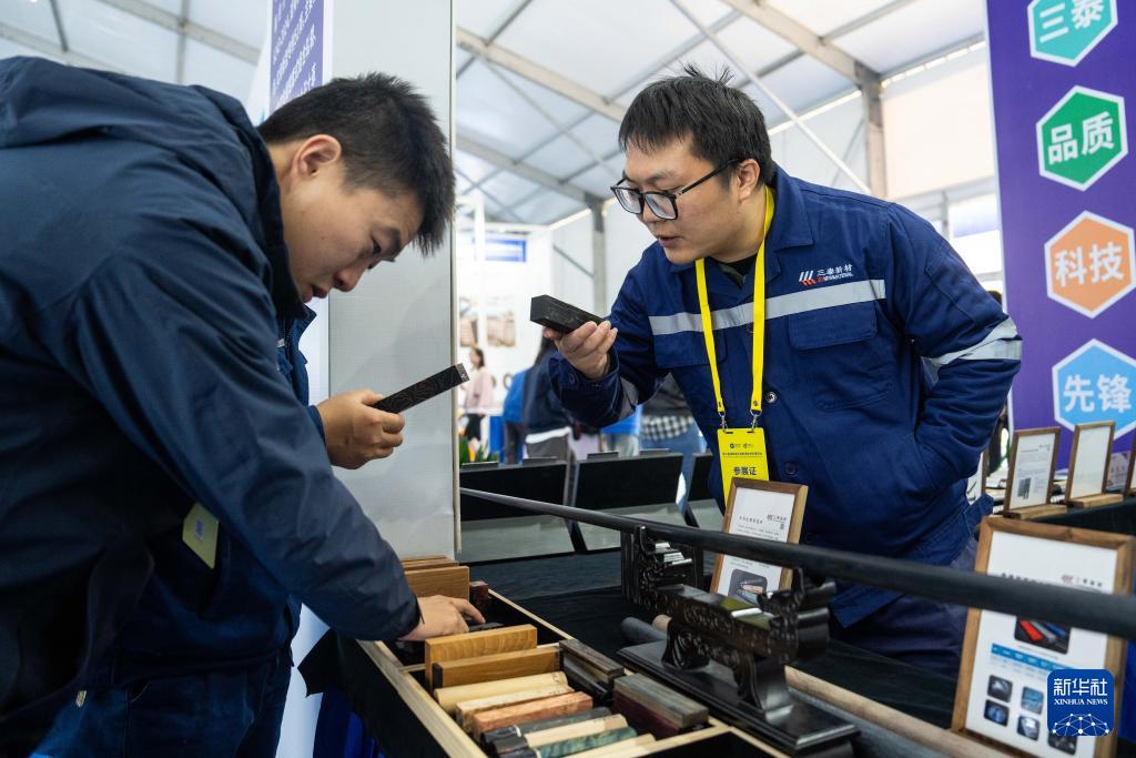 11月27日,在娄底经开区电力科技谷,参展商(右)在介绍木基复合材料。