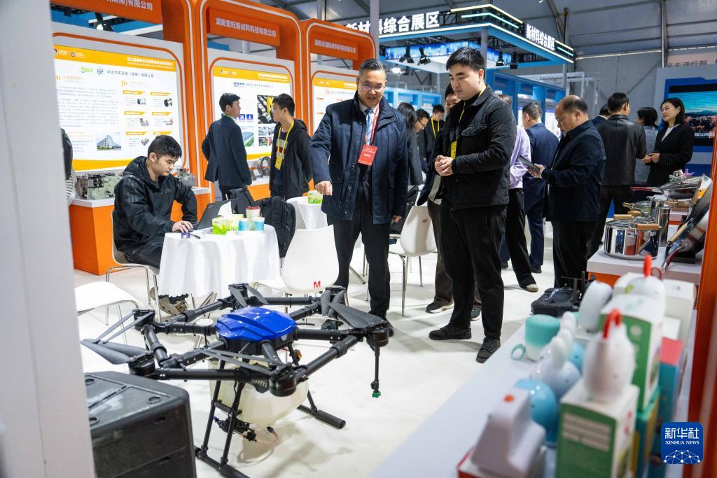 11月27日,在娄底经开区电力科技谷,参观者(中)在了解一款农用无人机。