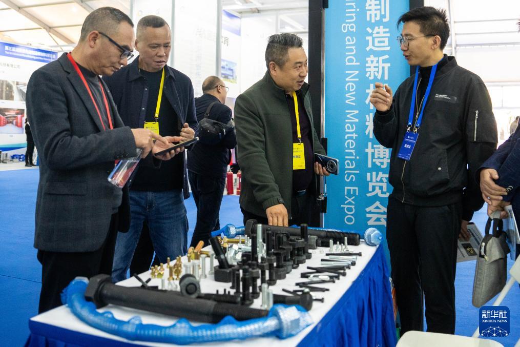 11月27日,在娄底经开区电力科技谷,参展商(左)在介绍金属切削液。