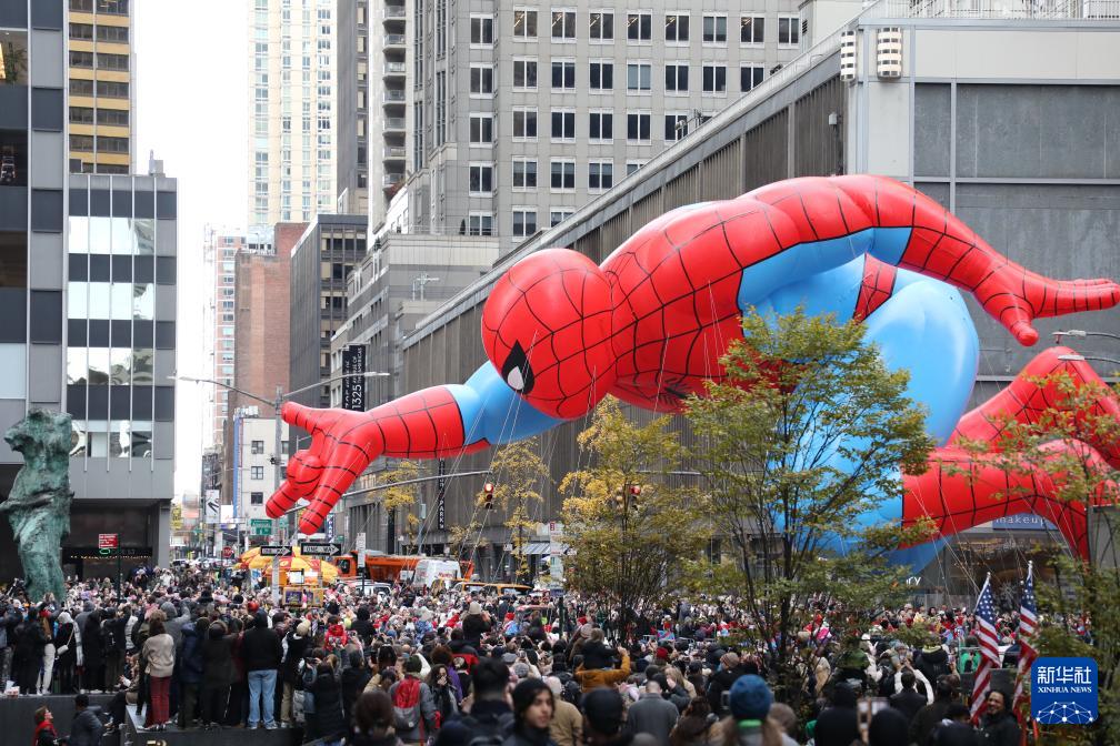 11月27日,在美国纽约,民众观看感恩节游行上的蜘蛛侠气球。