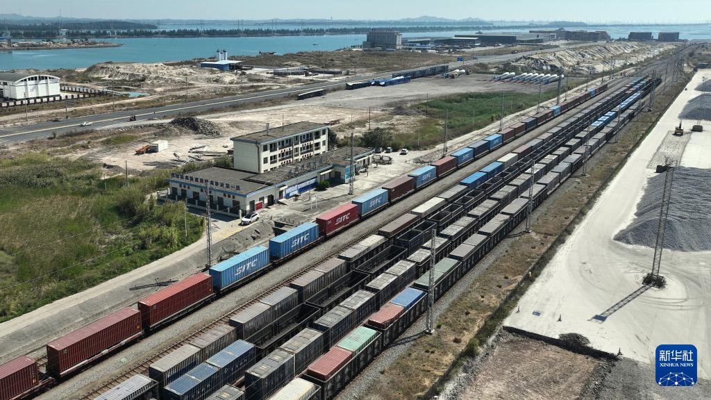 11月29日,在钦州港东站,铁海联运班列在等候出发指令(无人机照片)。