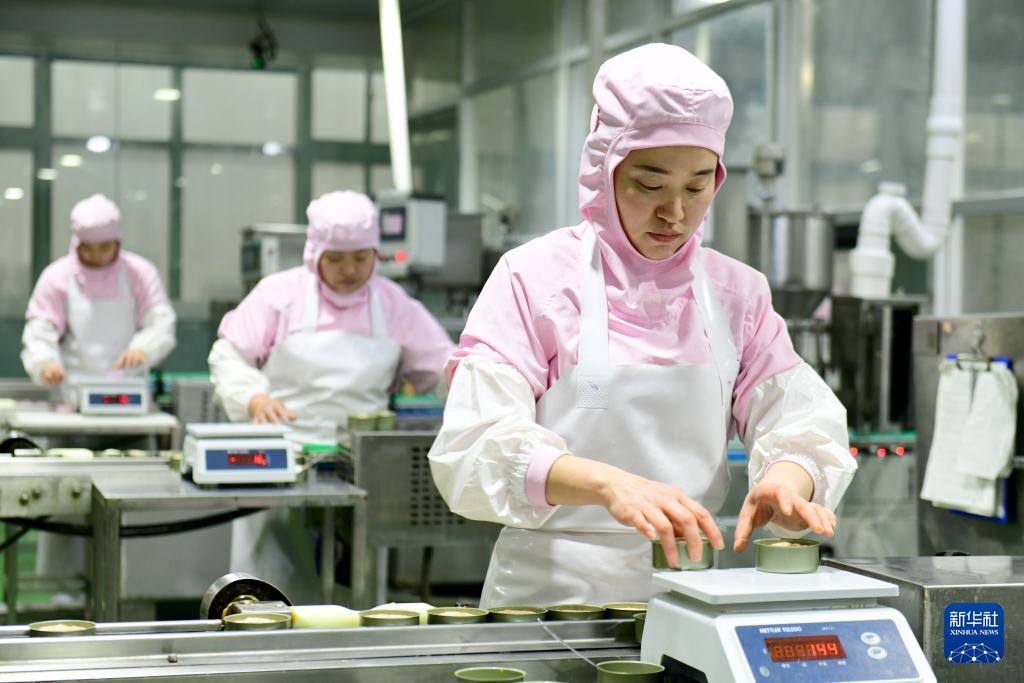 11月29日,在中誉宠物食品(菏泽)有限公司,工作人员对宠物食品进行称重。