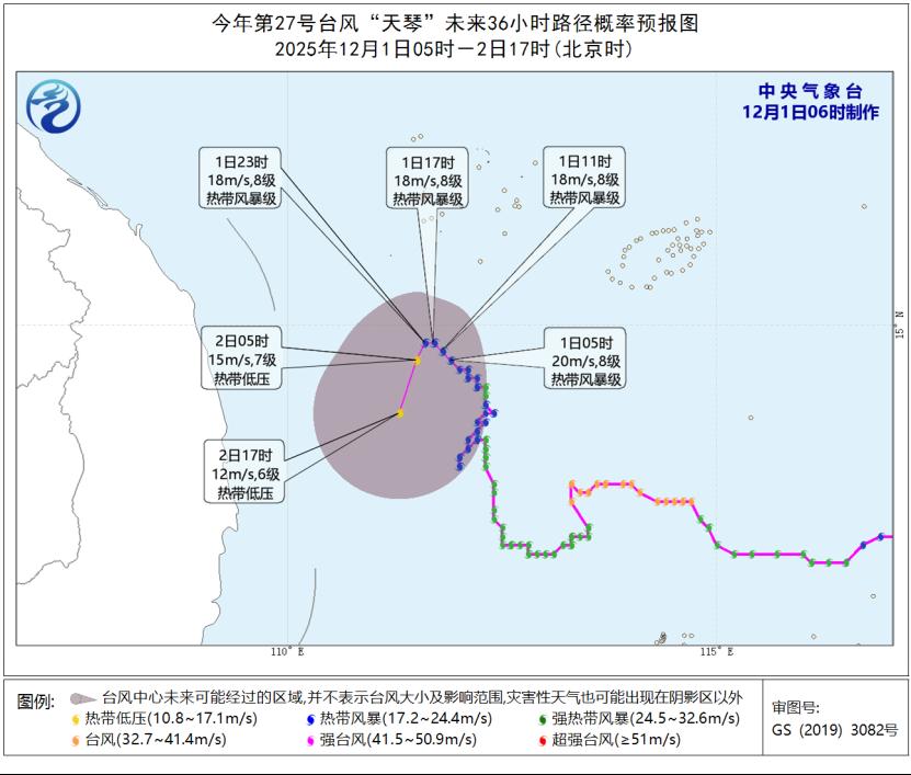 台风“天琴”未来36小时路径概率预报图(12月1日5时-2日17时)