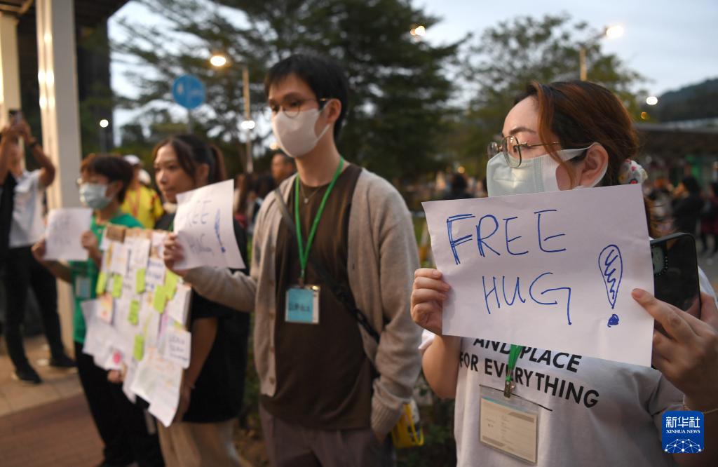 11月30日,义工在香港大埔广福休憩处举牌提供免费拥抱,提供心理疏导。新华社记者 陈铎 摄