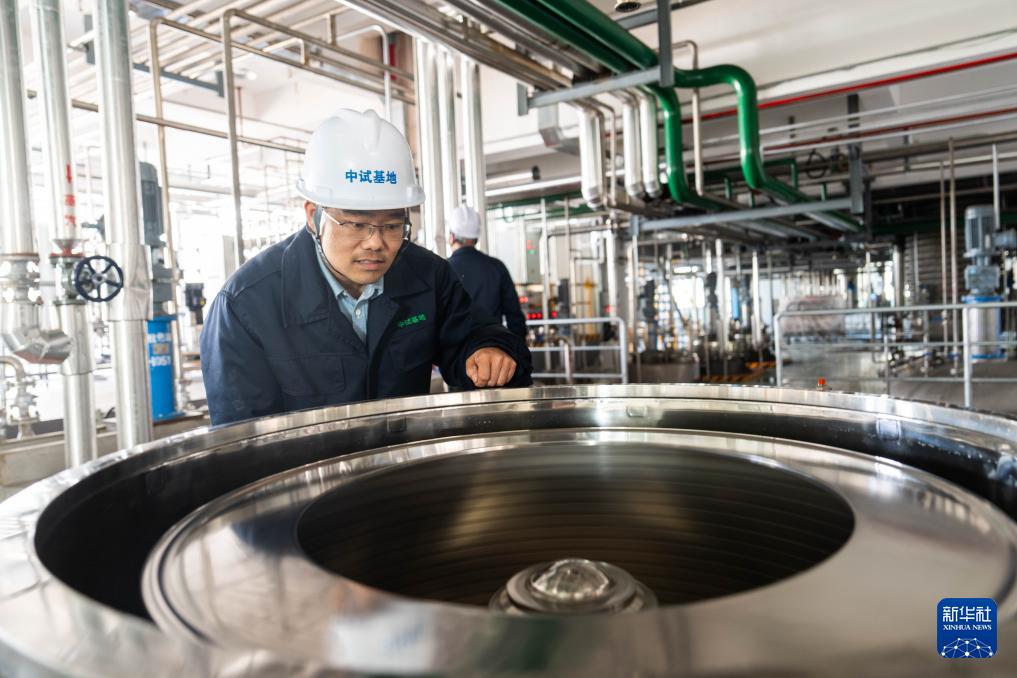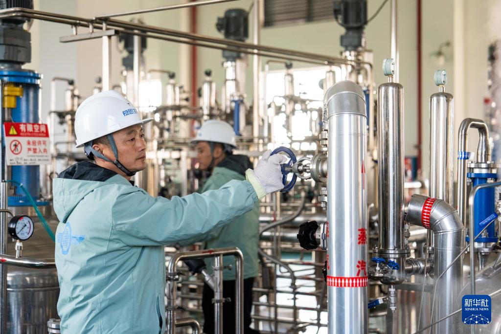 12月1日,在津市高新区的湖南生物制造中试基地发酵液提纯车间,工作人员使用平板离心机进行物料脱水作业。
