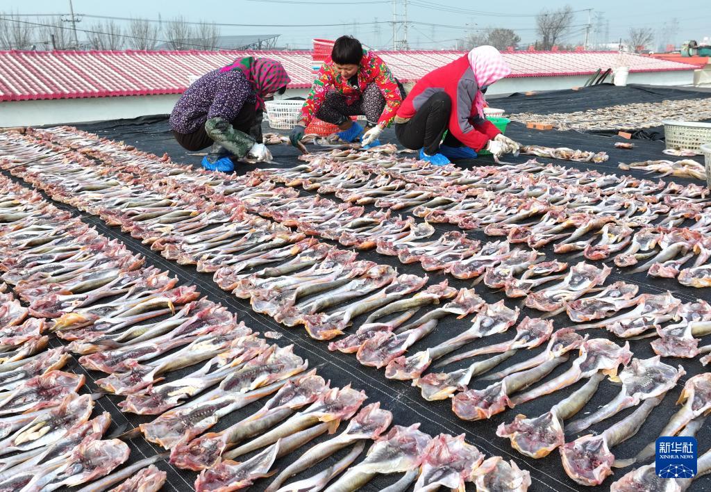 初冬时节,河北省唐山市丰南区黑沿子镇的渔民利用晴好天气,将捕捞的鱼虾等海产品进行加工、晾晒,供应市场。