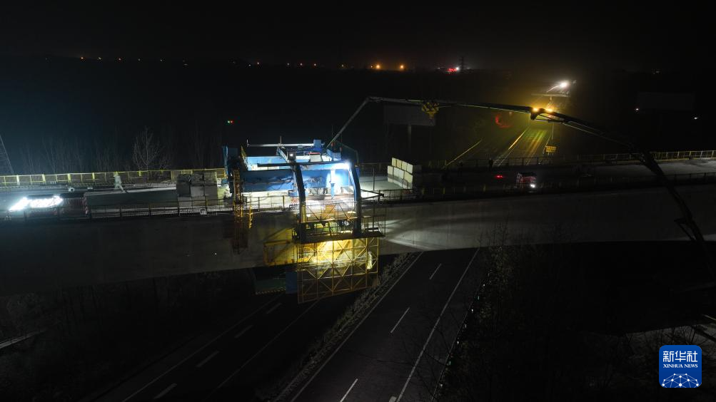 12月2日凌晨拍摄的合武高铁跨沪蓉高速特大桥合龙施工现场(无人机照片)。