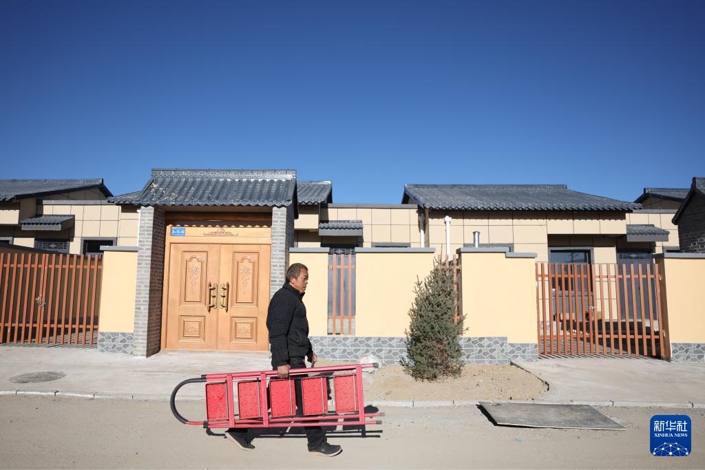 12月1日,在榆中县马坡乡旧庄沟村安置点,村民王利军提着梯子从新家门前的路上走过。
