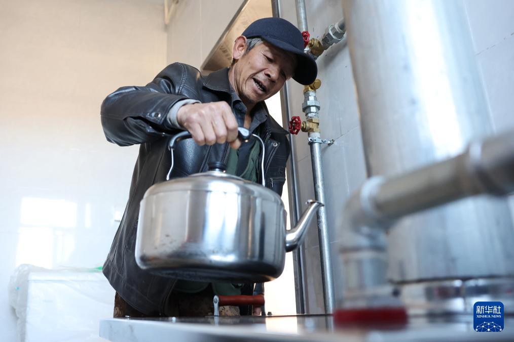 12月1日,在榆中县马坡乡旧庄沟村安置点,村民王建武在新家烧水。