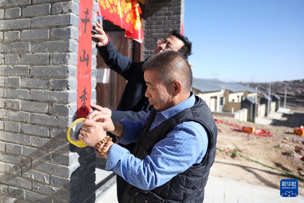 12月1日,在榆中县马坡乡马莲滩村集中安置点,村民张争琦(前)在给新家的大门贴对联。