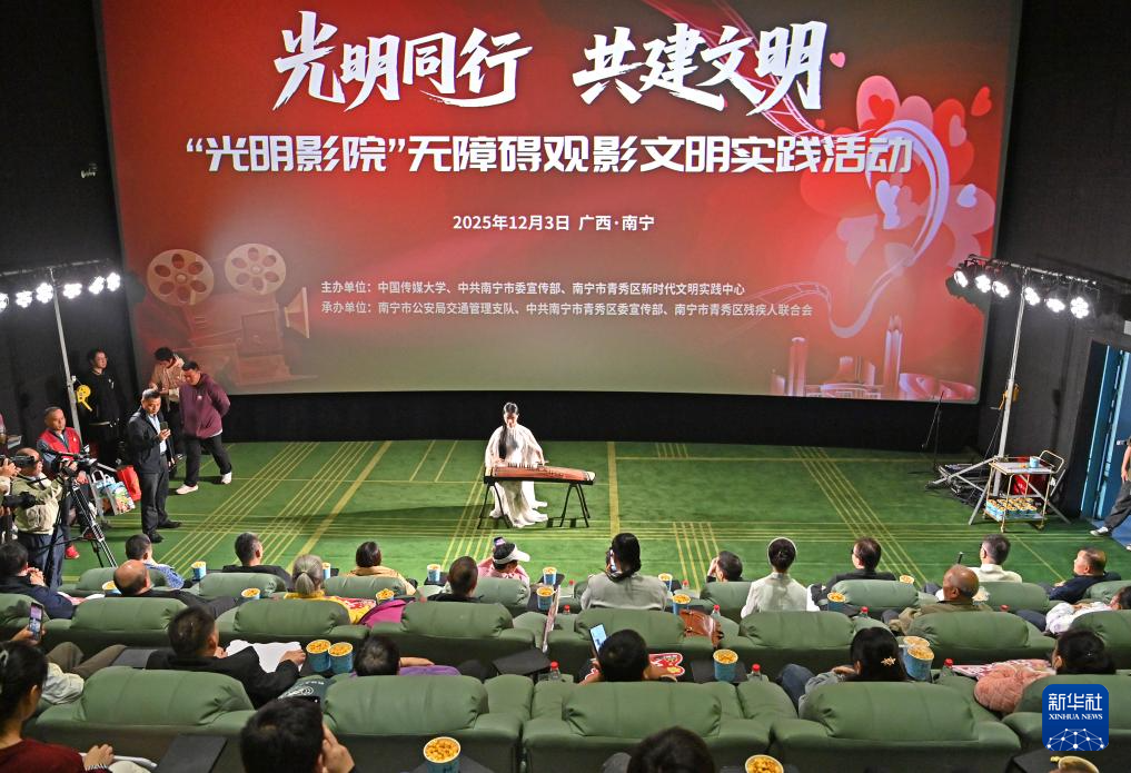 12月3日是第34个国际残疾人日。“光明影院”无障碍观影文明实践活动在广西南宁市青秀区博纳戏幕影城举行。40余名视障人士在亲属及志愿者的陪同下共同欣赏无障碍电影《热烈》,在光影叙事中感受文化魅力、体悟文明温度。