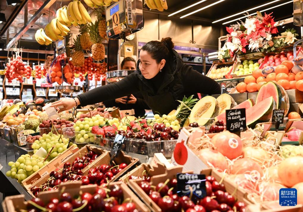 12月2日,摊贩在西班牙巴塞罗那市中心的博凯里亚市场售卖水果。