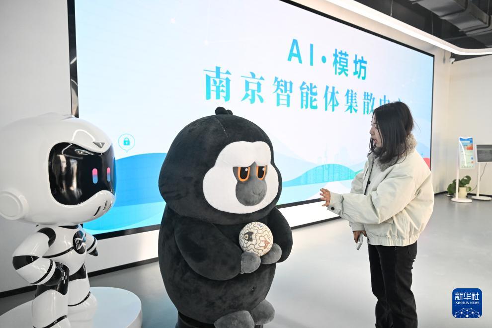 12月4日,在南京人工智能生态街区的“AI·模坊”南京智能体集散中心,一位女士与机器人互动。