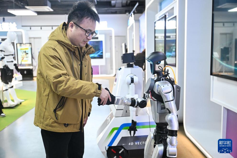 12月4日,在南京人工智能生态街区的“AI·模坊”南京智能体集散中心,工作人员与机器人握手。