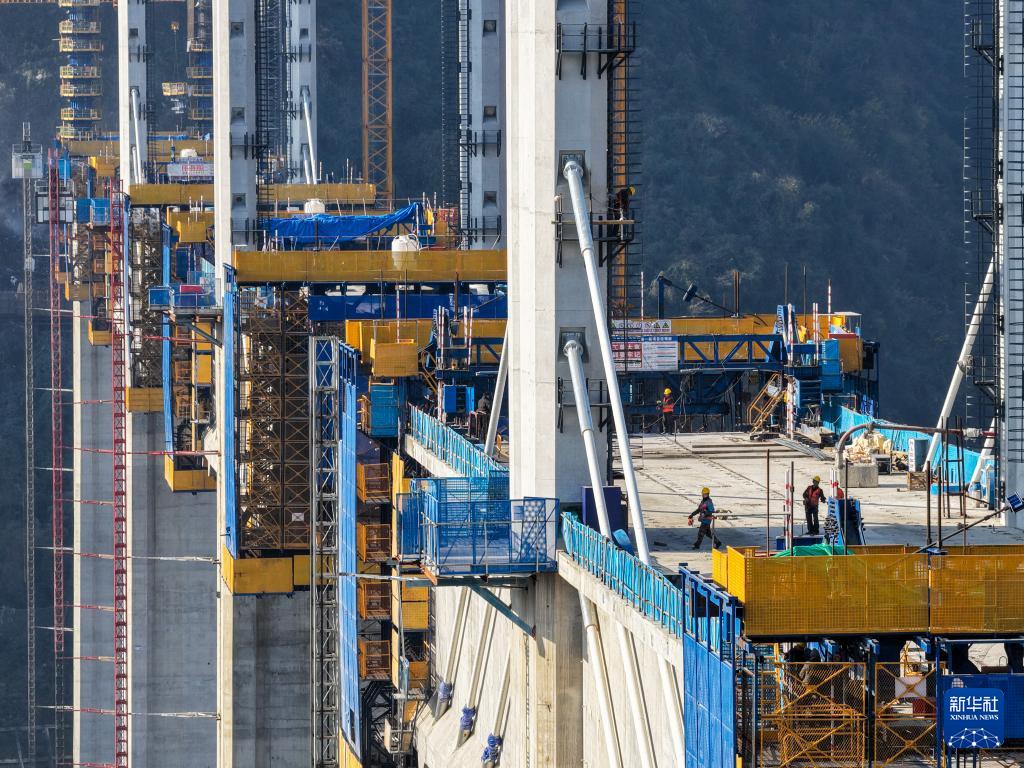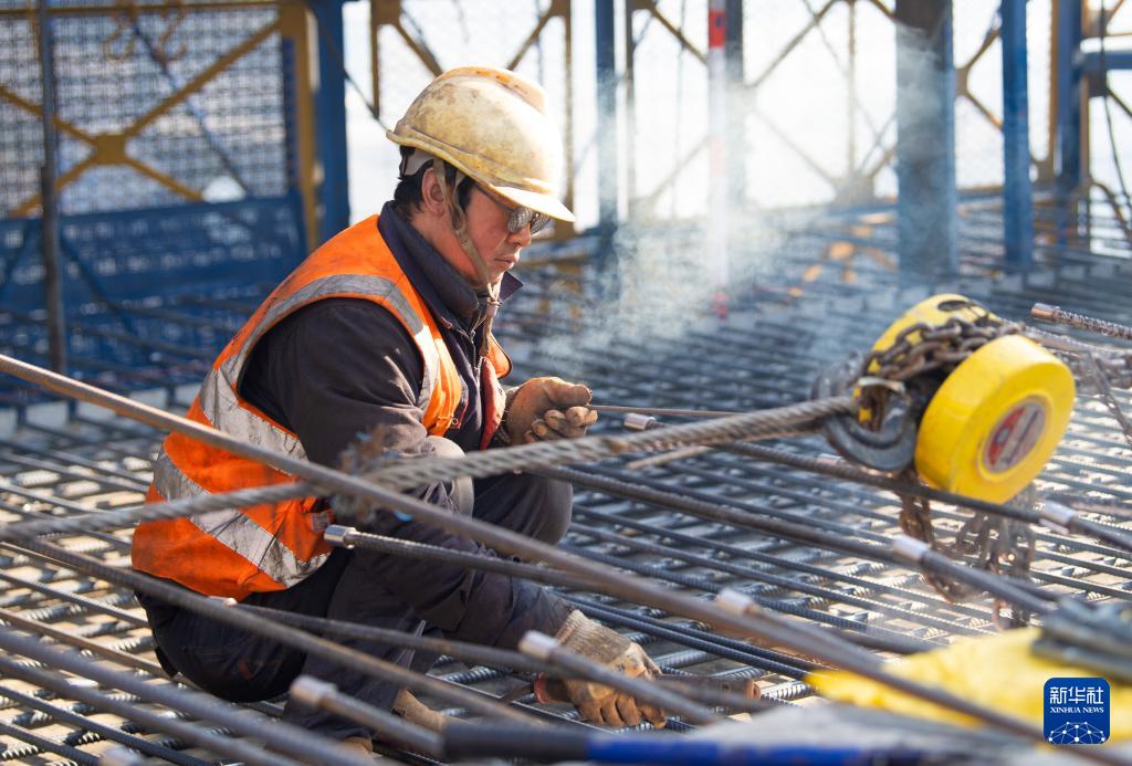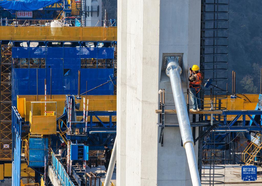 12月7日,工人在西渝高铁任河特大桥建设现场施工作业。