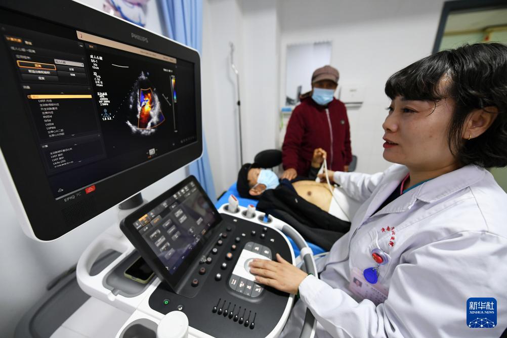12月7日,济南市中心医院医务人员为人工心脏植入手术康复者复诊。