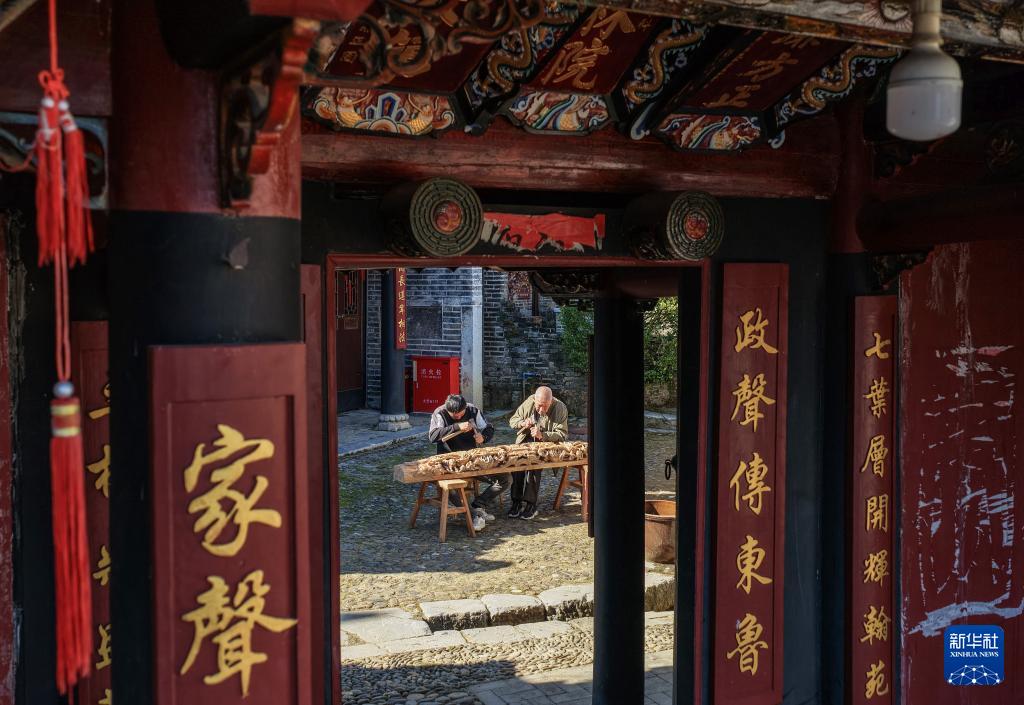 11月24日,祖孙两代木雕技艺省级非物质文化遗产代表性传承人、80岁的傅德雄(右)与35岁的傅航(左)在郴州汝城县金山村叶氏家庙(敦本堂)内刻木雕。叶氏家庙(敦本堂)于2013年被列为全国重点文物保护单位。