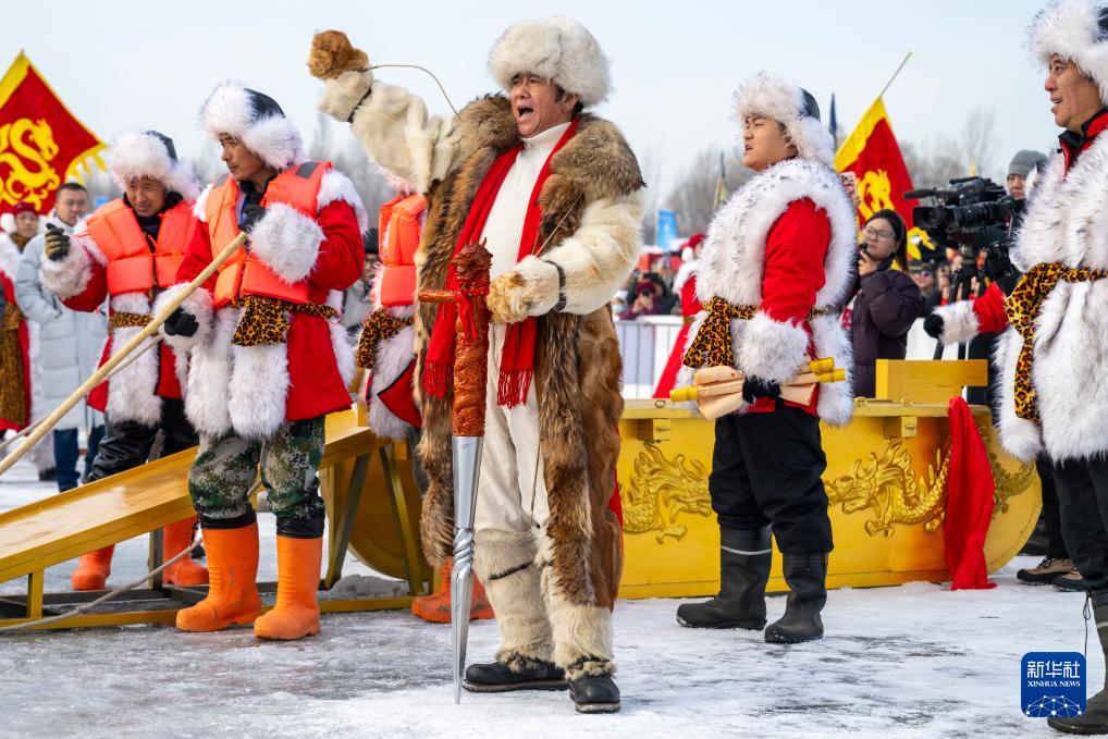 12月7日,在第六届哈尔滨采冰节现场,“冰把头”带领“采冰汉子”去采头冰。